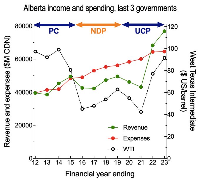Total expenses for each year of the UCP has been higher than any year the NDP was in power. Since Alberta’s revenue closely follows the price of WTI, we are headed to an economic crisis the next time the price of WTI drops unless we diversify our economy now